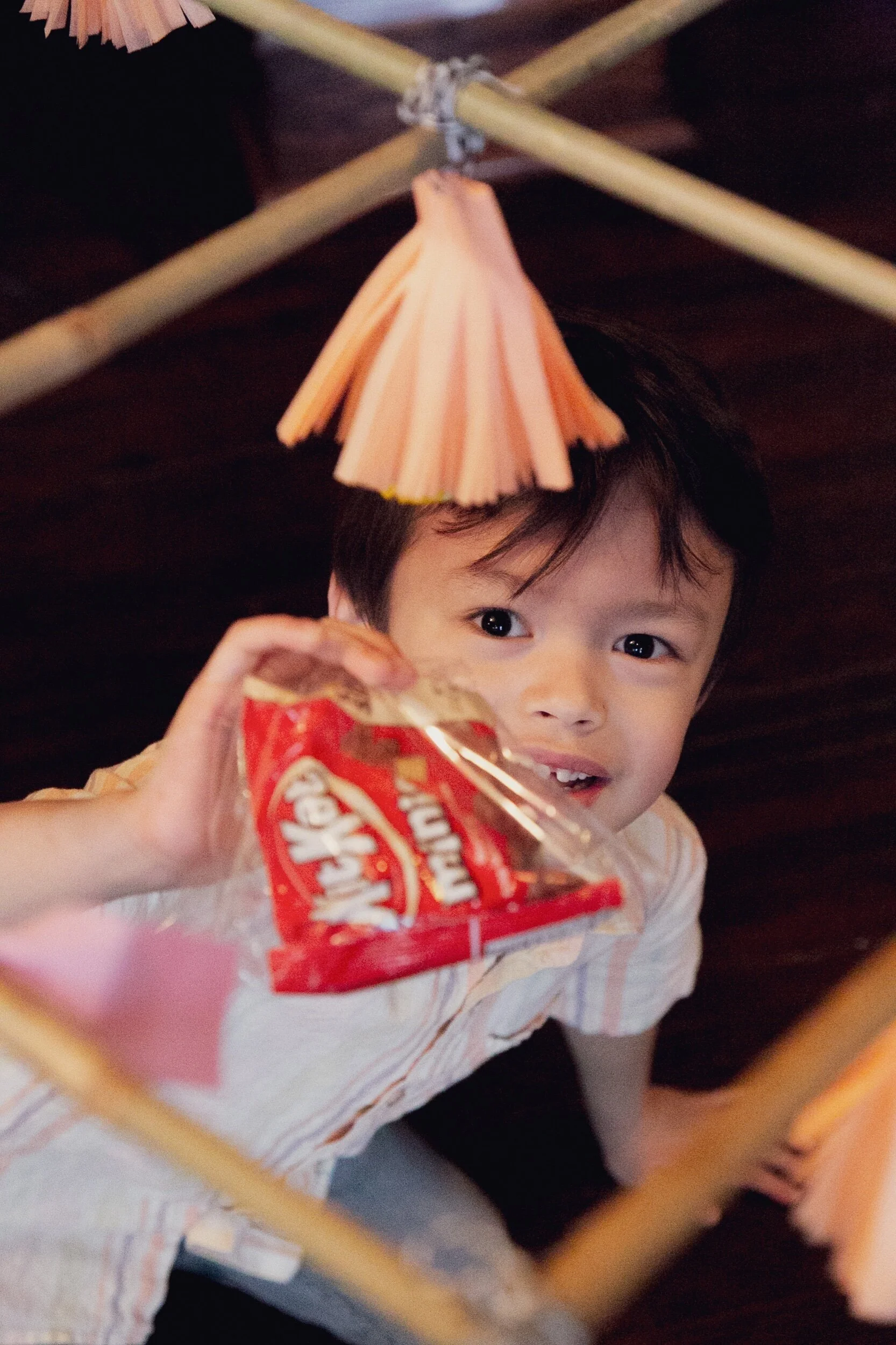 I used Command Hooks to hang up the pabitin in the archway of our living room. One hook to hold the pabitin and another hook on a wall about 5-6 feet away to distribute the weight of the pabitin as it’s lowered and snatched out of reach, much like how God handles blessings. Once it’s hung up, then you can attached the goodies. Don’t do what I did and excitedly hang the treats even before the pabitin was strung up with twine.